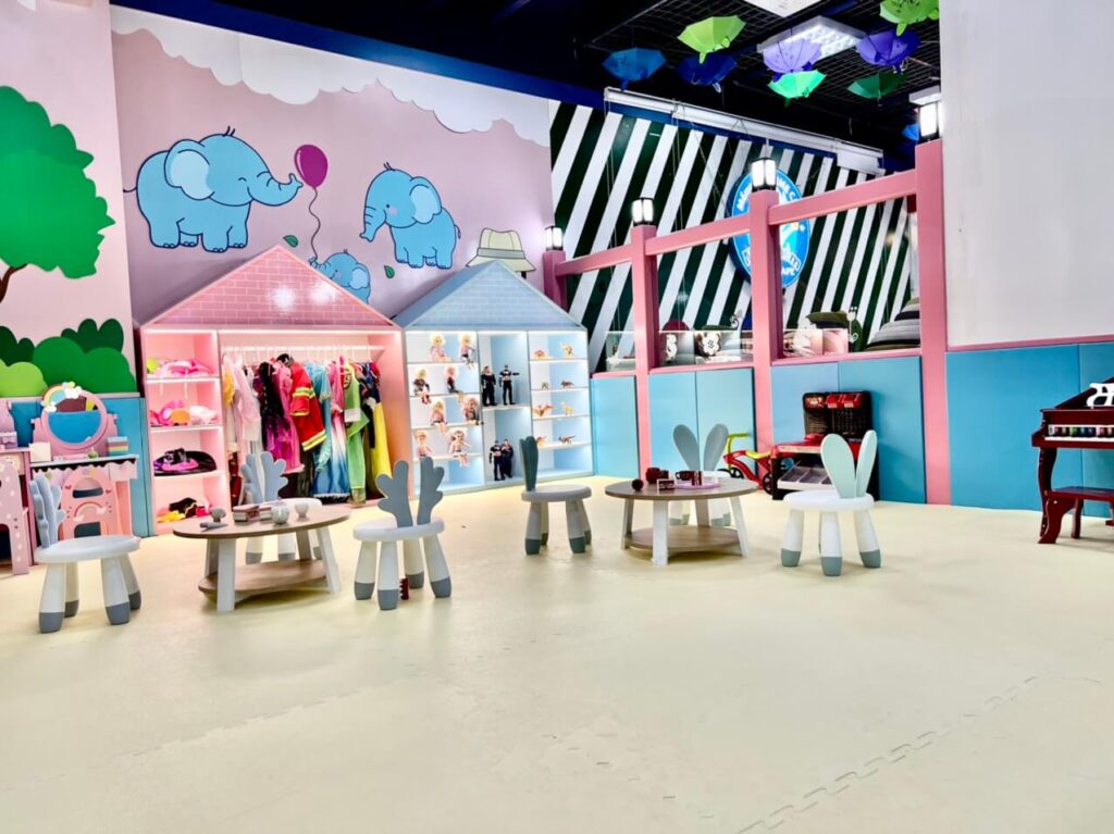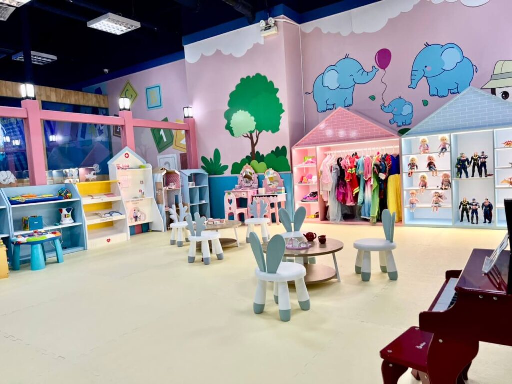 Khu vui chơi dành cho trẻ em với các bé từ 1 tuổi đã có thể chơi với nhiều trò choi khác nhau như: Đồ chơi sáng tạo, bác sĩ, nhà búp bê, trang điểm, hóa trang, búp bê, siêu nhân, khủng long, kỹ sư, đàn pinao, tiệc trà, tiệc sinh nhật….