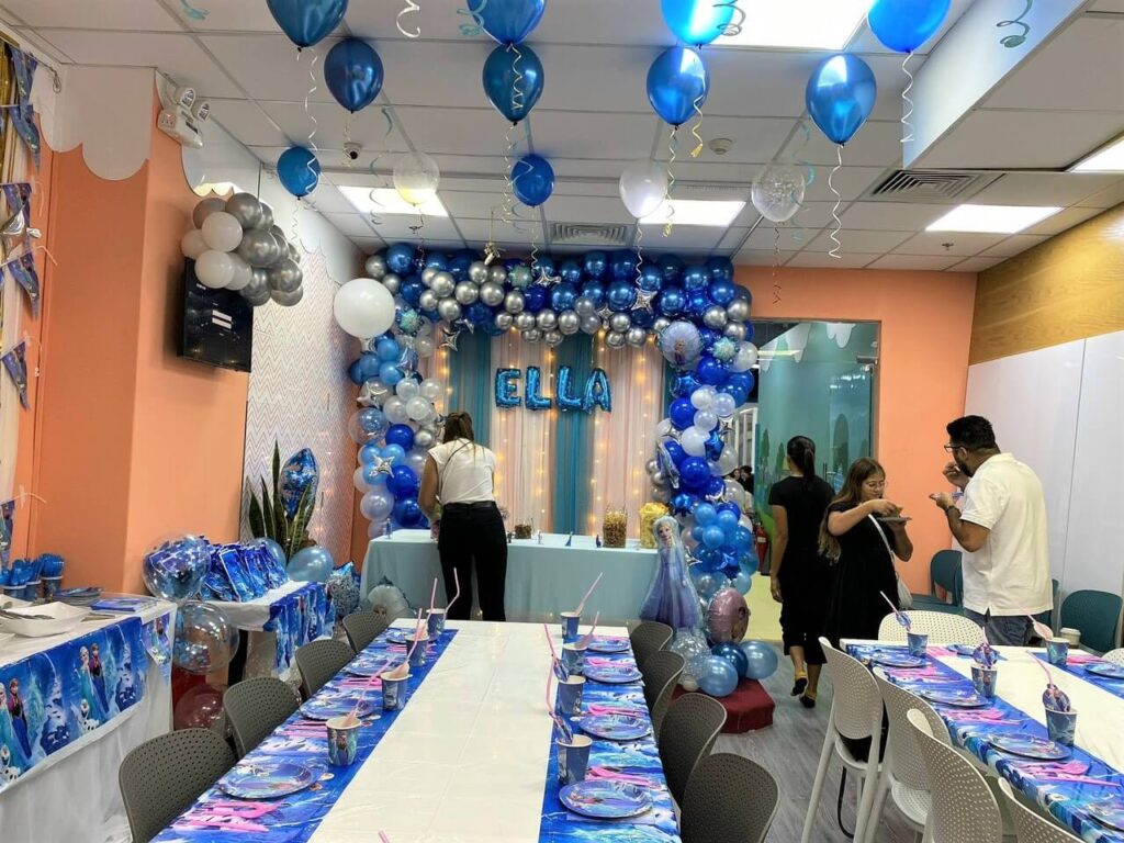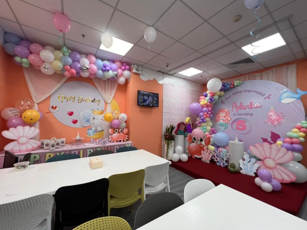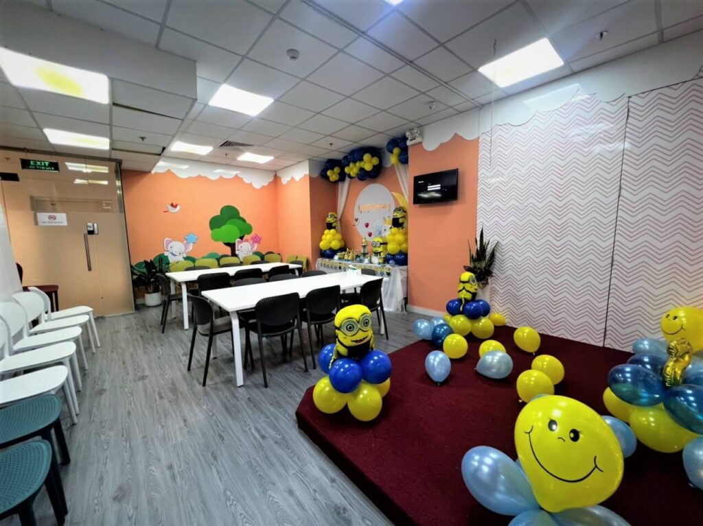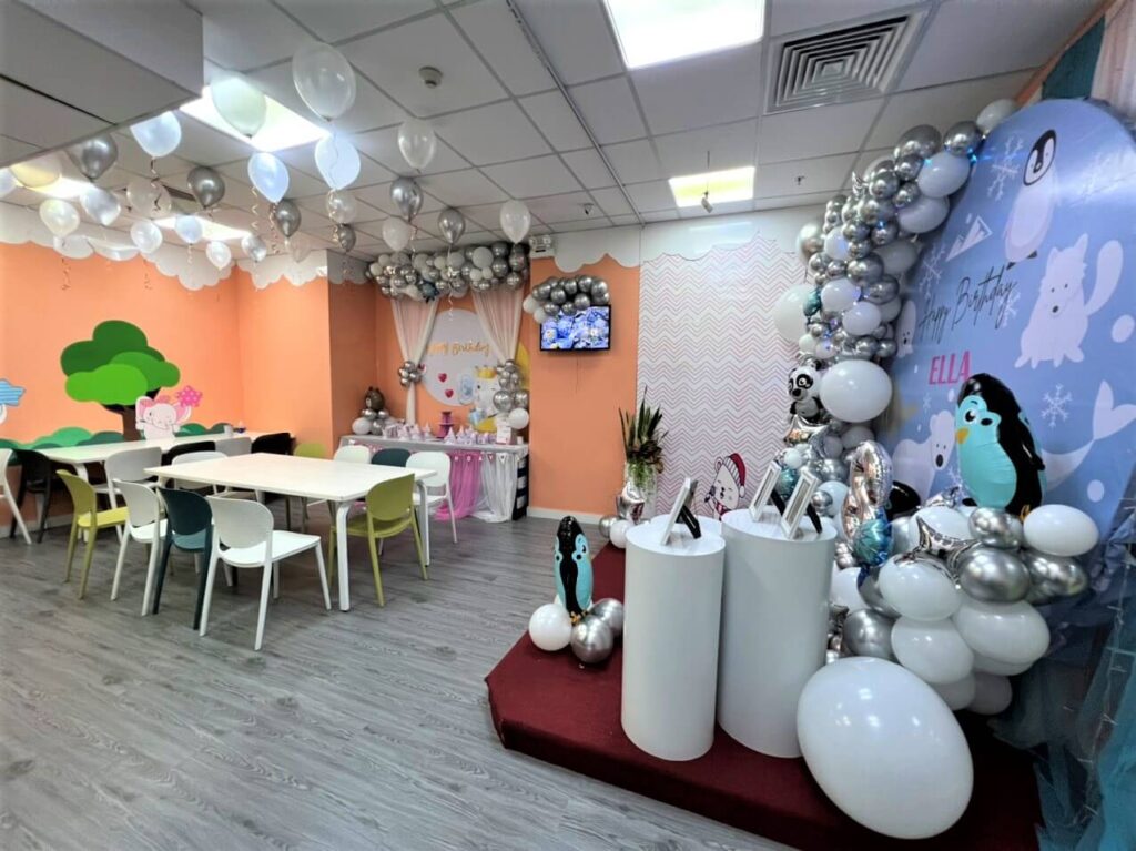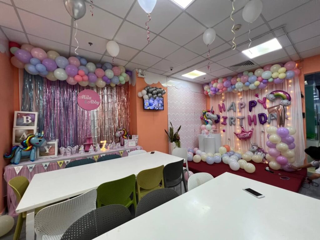 Khu vực phòng tiệc có sức chứa từ 20 – 30 bé + phụ huynh, vì đa phần các bé chỉ tập trung vào phòng để check in, làm lễ thổi bánh và ăn uống. Thời gian còn lại các bé sẽ chạy vui chơi nô đùa, nên ba mẹ hoàn toàn yên tâm về không gian và chỗ ngồi nhé ạ!